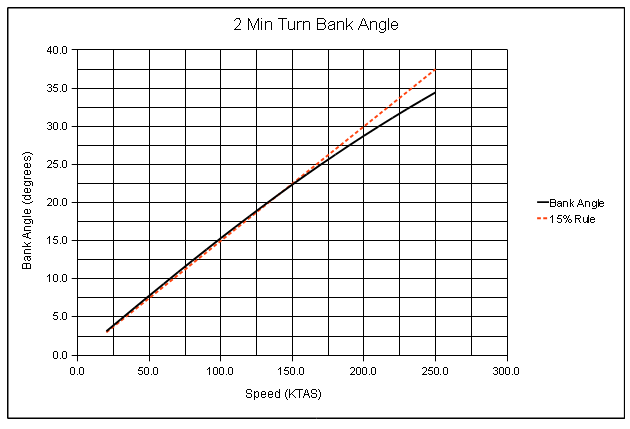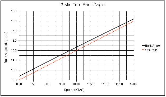 For example if a plane is flying at 100 KTAS, the bank angle for a 2 minute turn should be approximately 15 degrees (100 x 0.15 = 15) and the diameter of the circle would be 1.1 nautical miles (100 x 0.011 = 1.1). The computed bank angle is 15.3 degrees (2% error) and circle diameter would be 1.060 nautical miles (3.6% error).